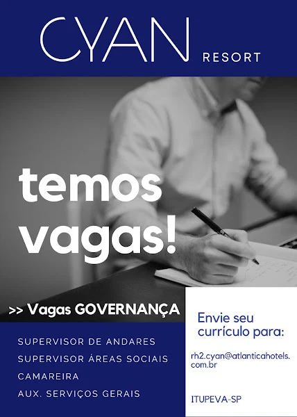 O Cyan Resort oferta DIVERSAS oportunidades de emprego. Clique nas imagens abaixo e veja quais são as áreas de atuação disponíveis e envie já o seu currículo de acordo com o e-mail informado pela empresa. Na hora de encaminhar o seu currículo, no ASSUNTO do e-mail, é necessário colocar: